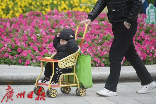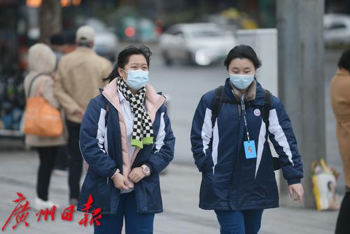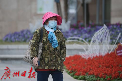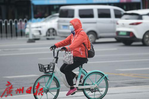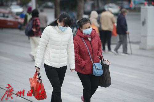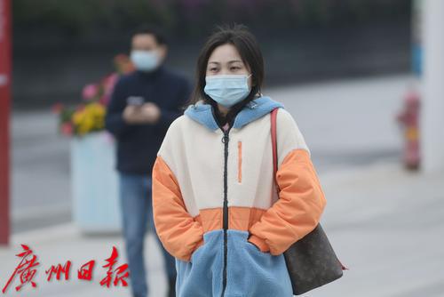 2021年12月27日上午,受寒潮影响,广州持续阴冷天气,全市寒冷橙色预警生效中。天河公园南门广场,包裹严实的市民顶风冒冷出行。