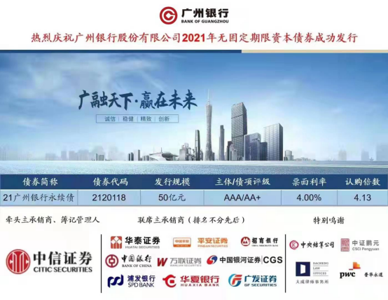 12月24日,广州银行首次采用创新资本补充工具,对一级资本进行多渠道资本补充,在银行间债券市场成功发行50亿元永续债,票面利率4.0%,创下今年以来全国范围内城商行同等评级永续债发行利率最低的优异成绩。