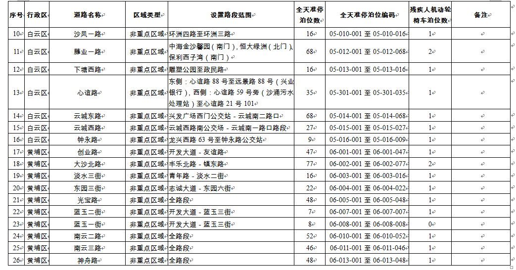 据相关负责人介绍,市交通运输部门根据《广州市中心六区城市道路临时泊位设置规划(2021年版)》实施要求,完成了海珠区天园路、白云区彩滨中路、黄埔区创业路等26条城市道路870个全天准停泊位标线和指示牌等服务设施设置工程,可向市民提供停车服务。