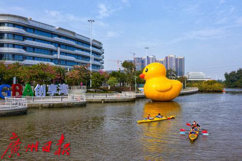 2021年12月,南沙创享湾。大黄鸭“游”到了南沙牌坊旁边的蕉门河上啦!近日,细心的市民应该留意到,曾风靡世界的大黄鸭来到了南沙创享湾。大黄鸭是继裸眼3D大屏幕后,创享湾又一个打卡拍照的吸睛点。记者从建设部门了解到,这只大黄鸭高约10米,于近期安装完成,是南沙水岸广场景观的组成部分。