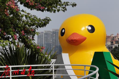 这只大黄鸭高约10米,于近期安装完成,是南沙水岸广场景观的组成部分。