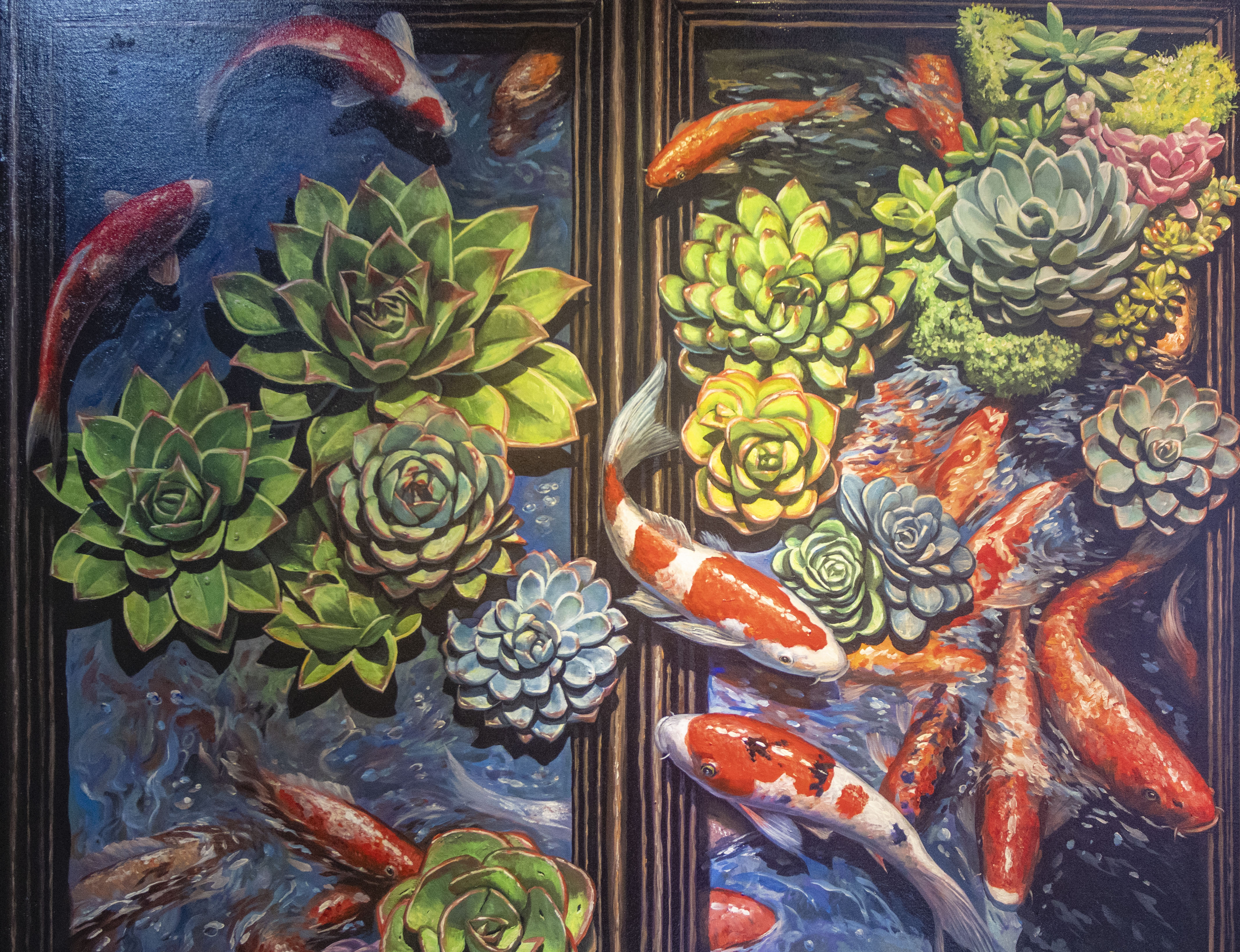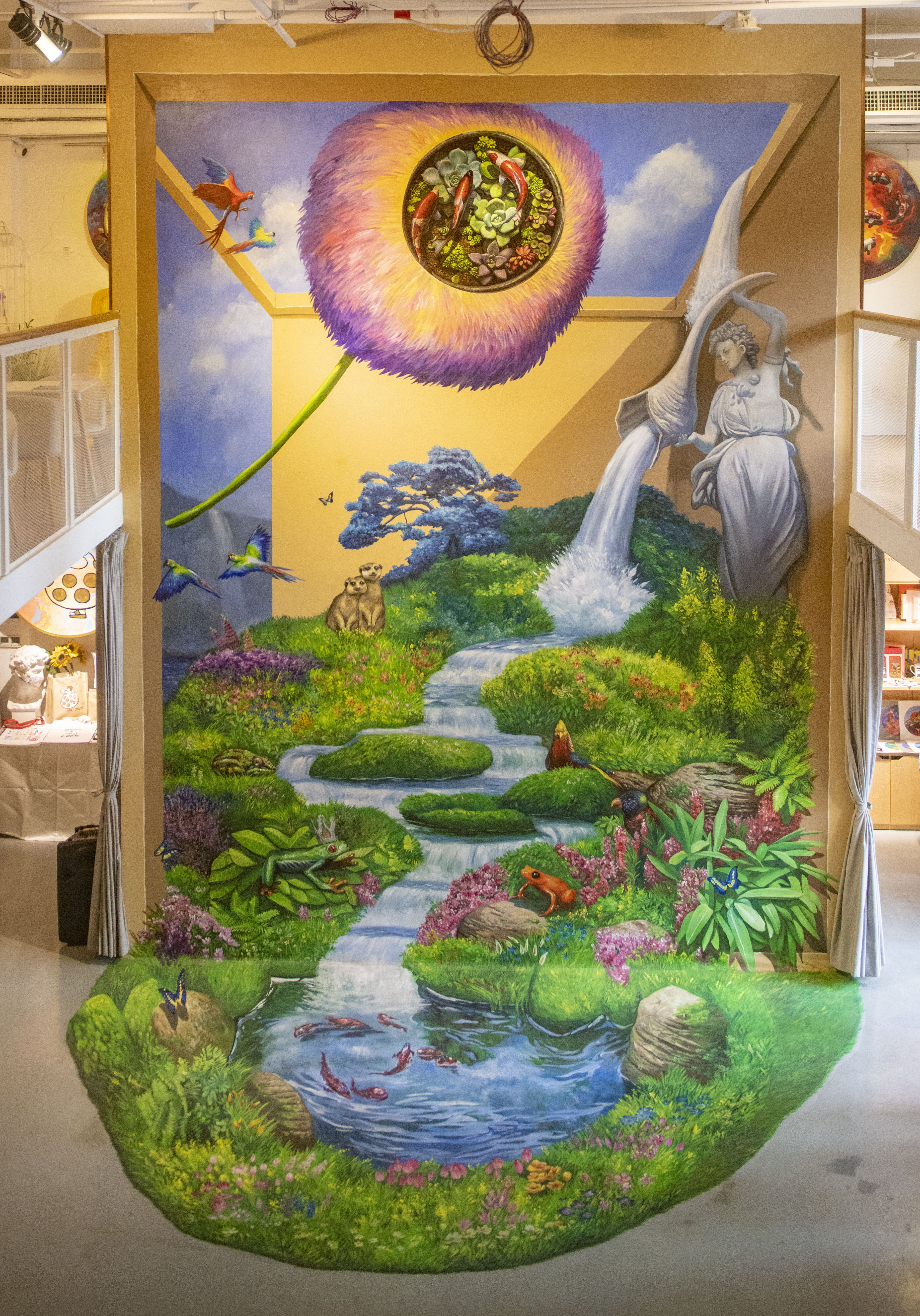 早期的3D画是一种商业艺术,“万氏兄弟”最初的作品大都被用作商业引流,在聚集人气上效果显著,因而它追求的是尽可能多的受众。广府文化中鲤鱼寓意聚财,万以珩喜欢鲤鱼,也喜欢把广府传统元素融入这种新形式的创作,以迎合上下两代人的审美。在自觉艺术馆的墙面以及中心,大都是以鲤鱼为主题的3D墙画。他在创作时,也会加一些天马行空的元素,比如《花开富贵图》里的牡丹花被换成了多肉植物,窈窕的西关小姐变成了胖乎乎的“西瓜小姐”,画面上会点缀细碎的人工水晶增加层次感。