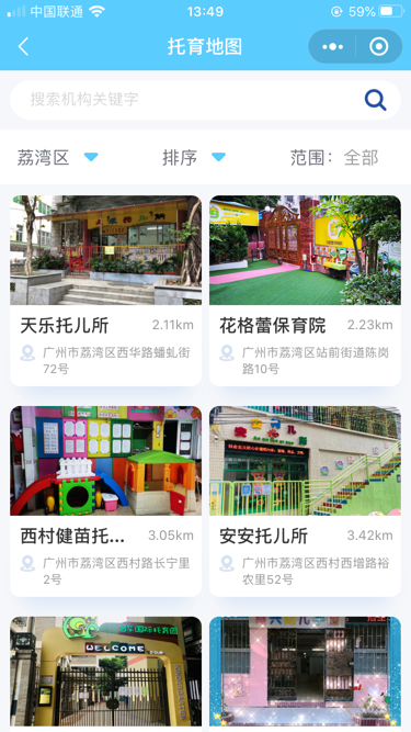 新手爸妈可以在微信中进入“保健熊”小程序,选择“托育地图”查找最近的托育机构,查看托育机构的详细地址、咨询方式、环境情况、备案信息等,并实现一键导航功能,极大方便家长挑选最合适的婴幼儿照护方式或机构。其中,荔湾区有18家托育机构上榜。