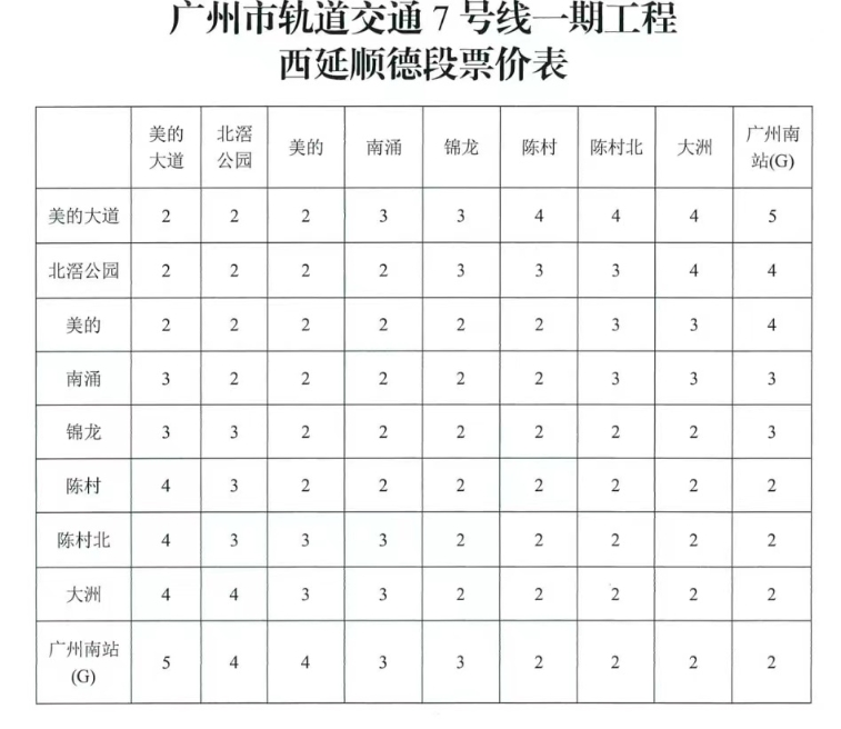 12月29日,广州市发展改革委、佛山市发展改革局发布了《关于广州市轨道交通7号线一期工程西延顺德段票价的批复》(简称《批复》),广州市轨道交通7号线一期工程西延顺德段开通后,美的大道站到广州南站(G)全程票价为5元。