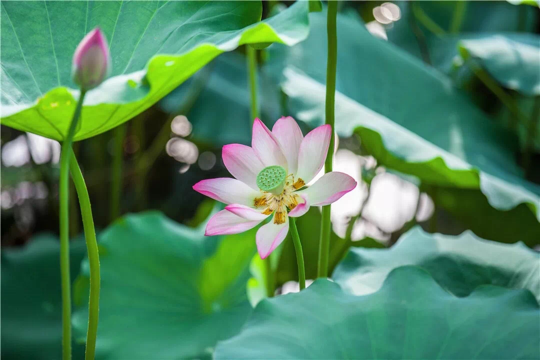 夏天看荷花。夏天的荔湾湖公园,满眼的碧波荡漾,一片片荷叶如碧玉般铺满荷塘。