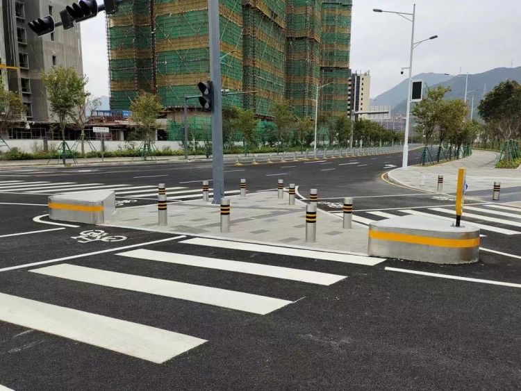 同时对设施进行升级。路上主要十字路口及交叉口对自行车过街系统采用了高分子聚合物彩色抗滑铺面进行标识,有效降低非机动车道与机动车道的交叉和干扰;自行车道与人行道衔接处设置自行车道柔性防撞杆,间距为1米,自行车骑行者减速通过时,无须下车,就能确保安全通行;给排水检查井由传统的球墨铸铁井盖更新为自调式防沉降井盖和隐藏式井盖,解决传统井盖下沉、车轮碾压时铁件碰撞噪音。