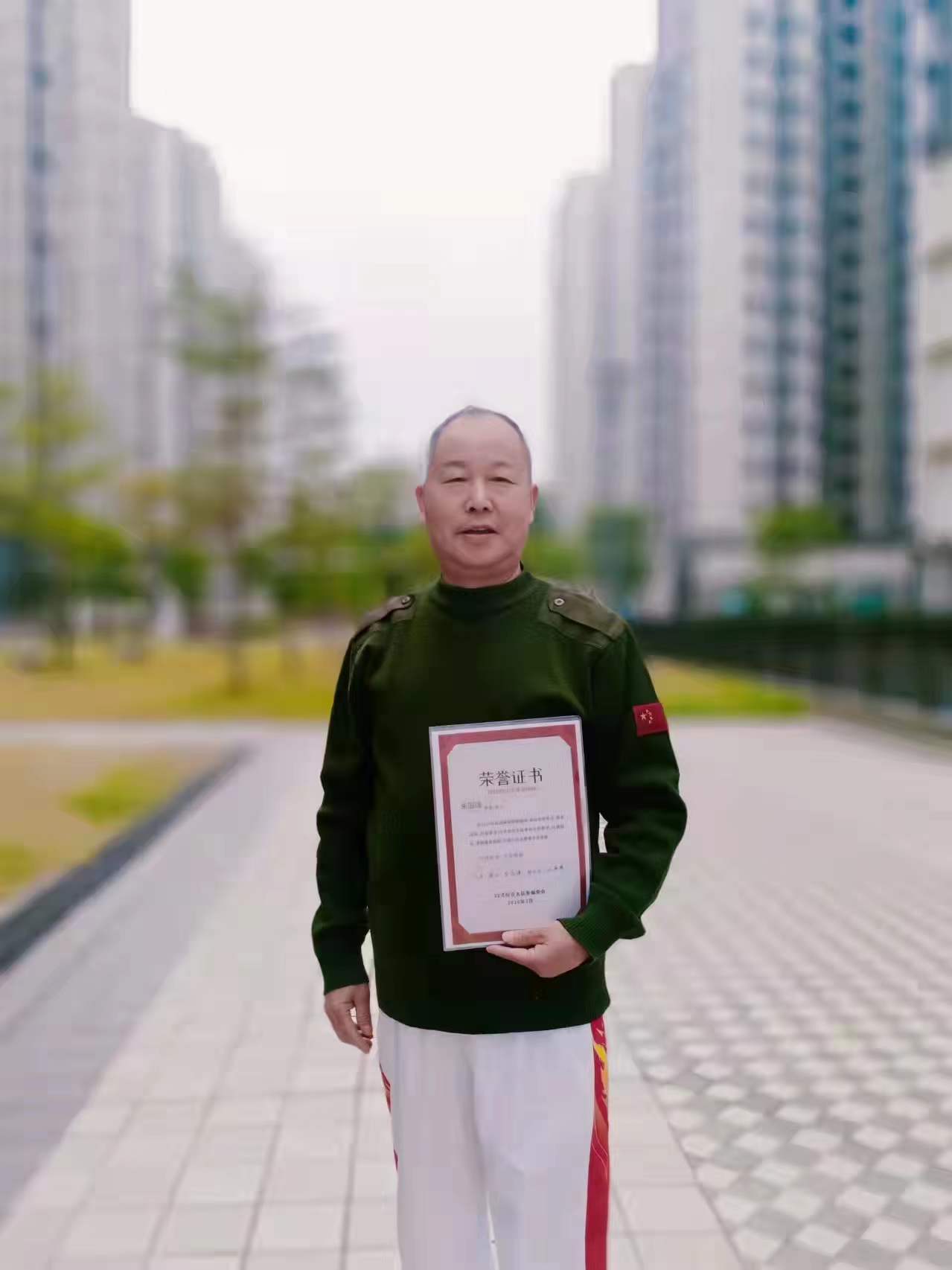 我是珠江嘉苑小区的一名保障房住户。党和国家给了我这么大的关怀,我决心尽我所能为社会多做贡献。作为一名有着45年党龄的退伍军人,我时刻牢记为人民服务的宗旨。入住珠江嘉苑小区以来,我热衷于小区公益活动,发挥自身太极教练员的优势,组织小区住户学习太极,强身健体。此外,我受广州市老年委委托已连续八年义务组织老年人活动,且每周三组织老年人在越秀公园开展各类文艺活动,曾组织广场舞、太极拳、气功、持杖操舞等比赛,为和谐社区建设贡献力量。