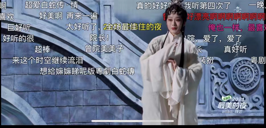 早在这部粤剧电影尚未上映之时,便有多位B站UP主在看过预告片后,惊喜地向公众“安利”。影片2021年5月20日正式公映后,无数B站的年轻人成为《白蛇传·情》的“自来水”,口口相传地为影片“打call”。影片上映后不仅刷新中国影史最高戏曲电影票房纪录,更成为2021年中国传统文化通过电影“出圈”的一个现象级案例。而在直播期间,不少B站青年也再度为这部粤剧电影打CALL,“2021年度我的最佳电影!”“再为影片打CALL,咱们的传统文化是真的美!”