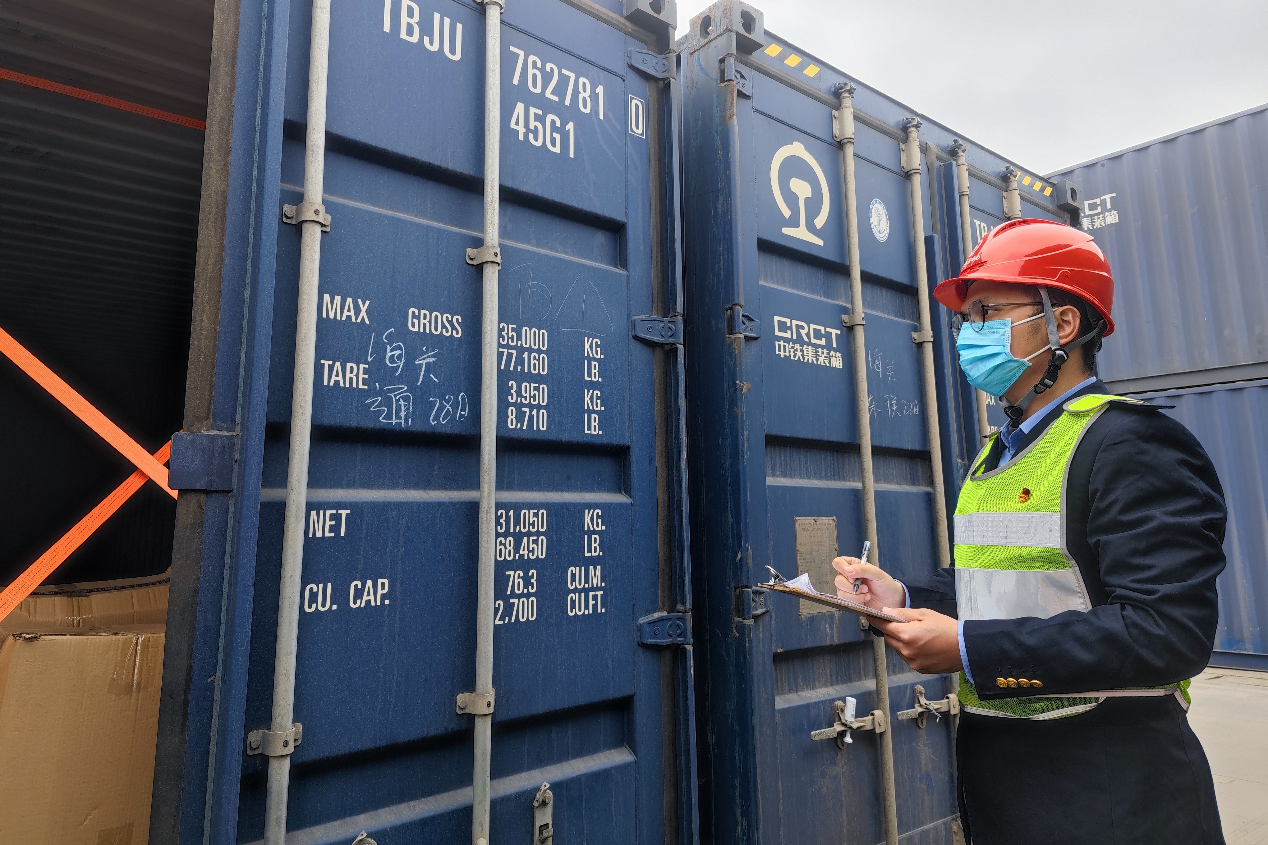 铁路货运员在对班列进行开箱检查。刘雅琴摄