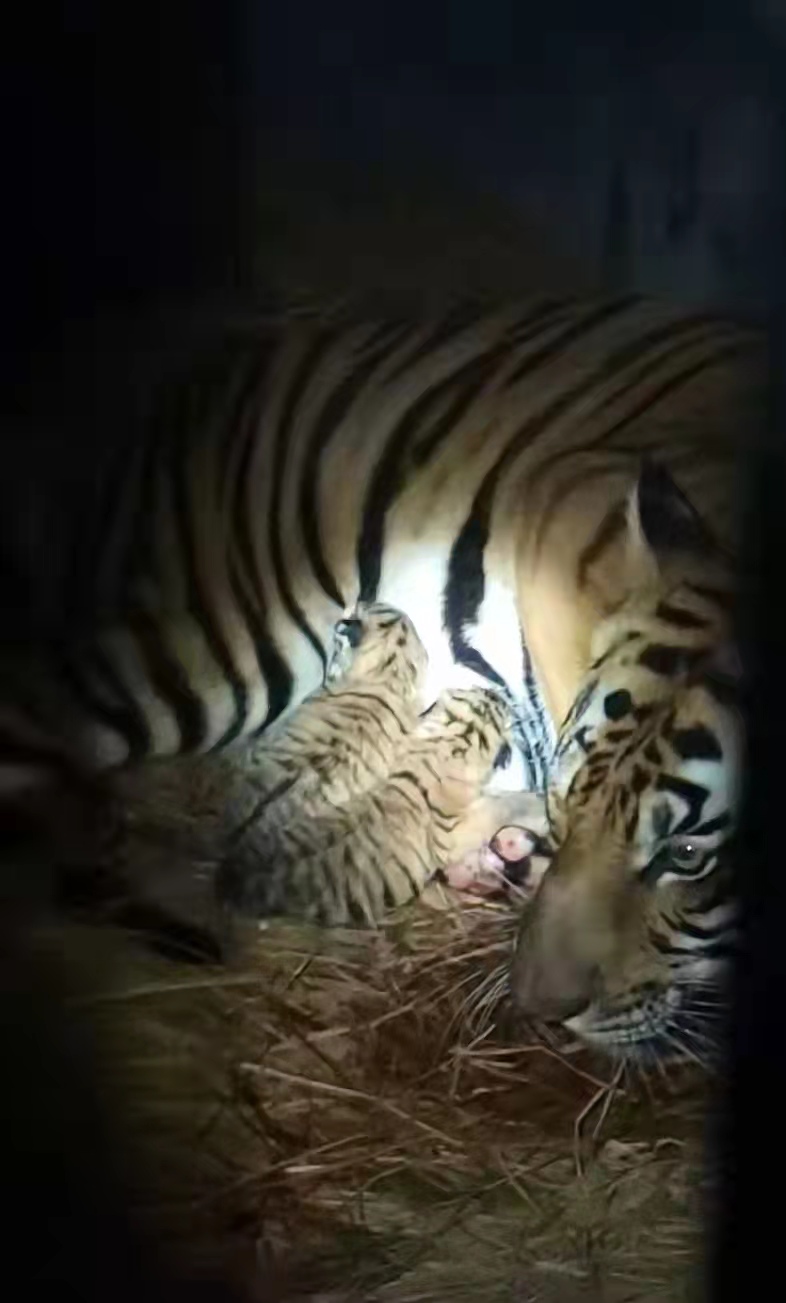 2021年12月31日23时2分、26分,韶关华南虎繁育研究基地的华南虎梦梦生下一对珍贵的华南虎宝双胞胎。由于到现在还没有从母虎身边取出来,所以暂时无法辨别性别和称重。