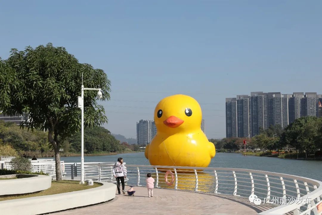 在南沙创享湾,一个高约10米的大黄鸭吸引不少市民前来拍照,小朋友们见到憨态可爱的大黄鸭更是欢呼雀跃。在天高云淡,水清岸绿的美景映衬下,黄黄的鸭子仿佛灵动起来,配合两岸的绿化、时花,为整个水岸广场增色不少,成为了南沙新晋打卡点。