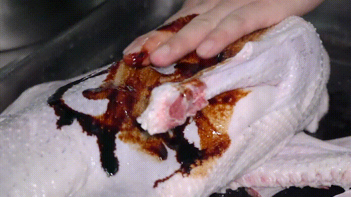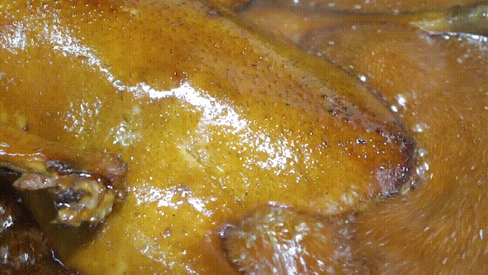 将涂满酱汁煎至后的鹅放入多种香料及特制酱油调成的酱汤中,高温将香气瞬间激发,空气中弥漫着浓浓的酱香。