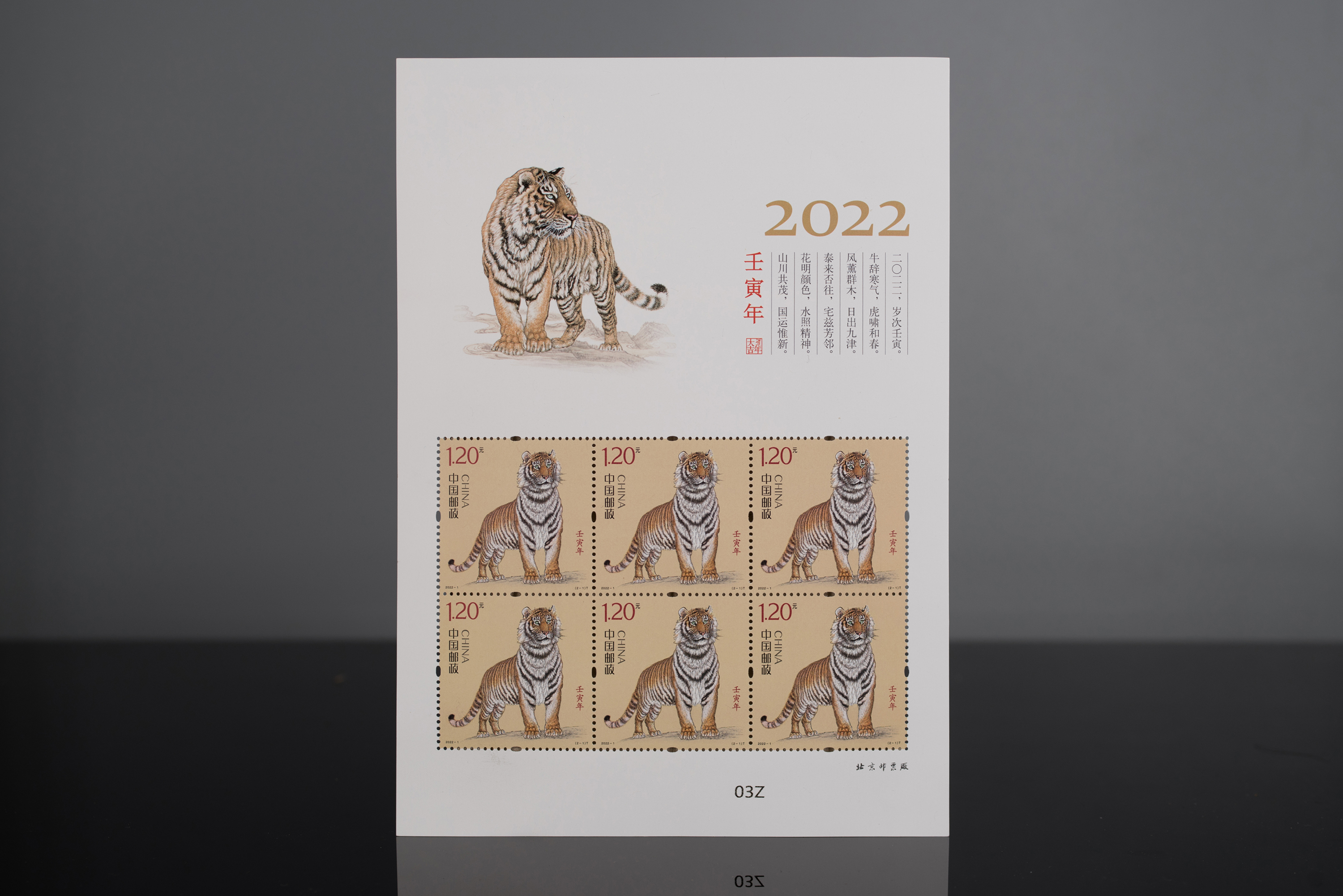 《壬寅年》特种邮票由著名画家冯大中先生创作,邮票1套2枚,全套邮票面值2.40元。延续了第四轮生肖邮票的设计理念,诠释“国”与“家”的概念。第一枚邮票名为“国运昌隆”,描绘了一只气宇轩昂的上山虎形象,矗立远眺、志存高远,传达出国家蒸蒸日上、雄心壮志的含义;第二枚邮票名为“虎蕴吉祥”,描绘了面容温婉的虎妈妈带着两只小虎的温馨场景,寓意儿孙兴旺、家庭美满。