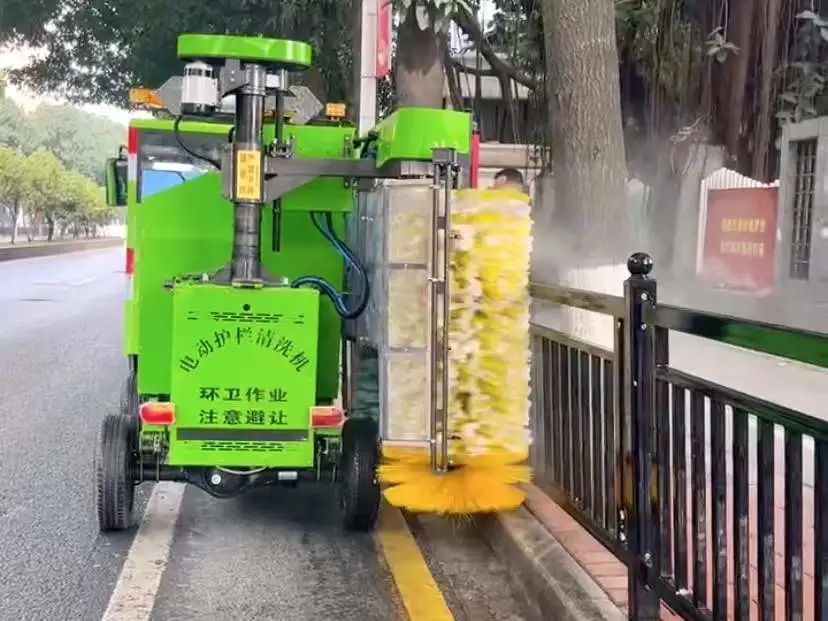 护栏清洗车作业效率快、清洗质量高、运行稳定安全,两个清洗转轴全方位夹着交通护栏快速旋转,上百米的护栏只需几分钟,便被擦洗得锃亮如新。