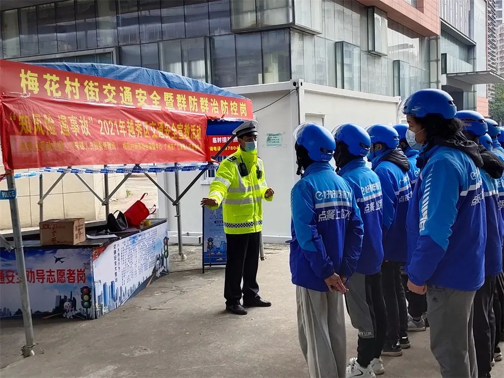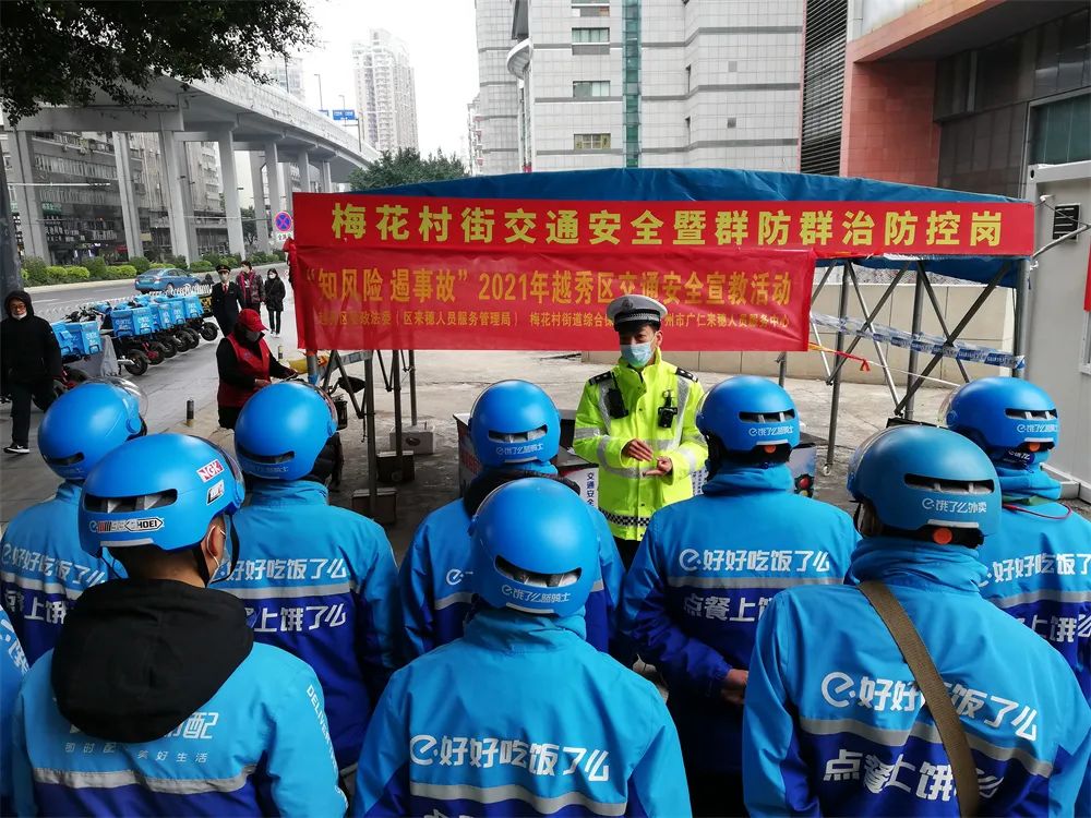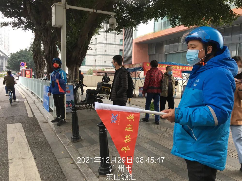 2021年12月29日上午,活动在梅东路交通岗发动了多名“饿了么”外卖小哥,一起参与对行人、电动单车的交通安全劝导、交通安全宣传等。