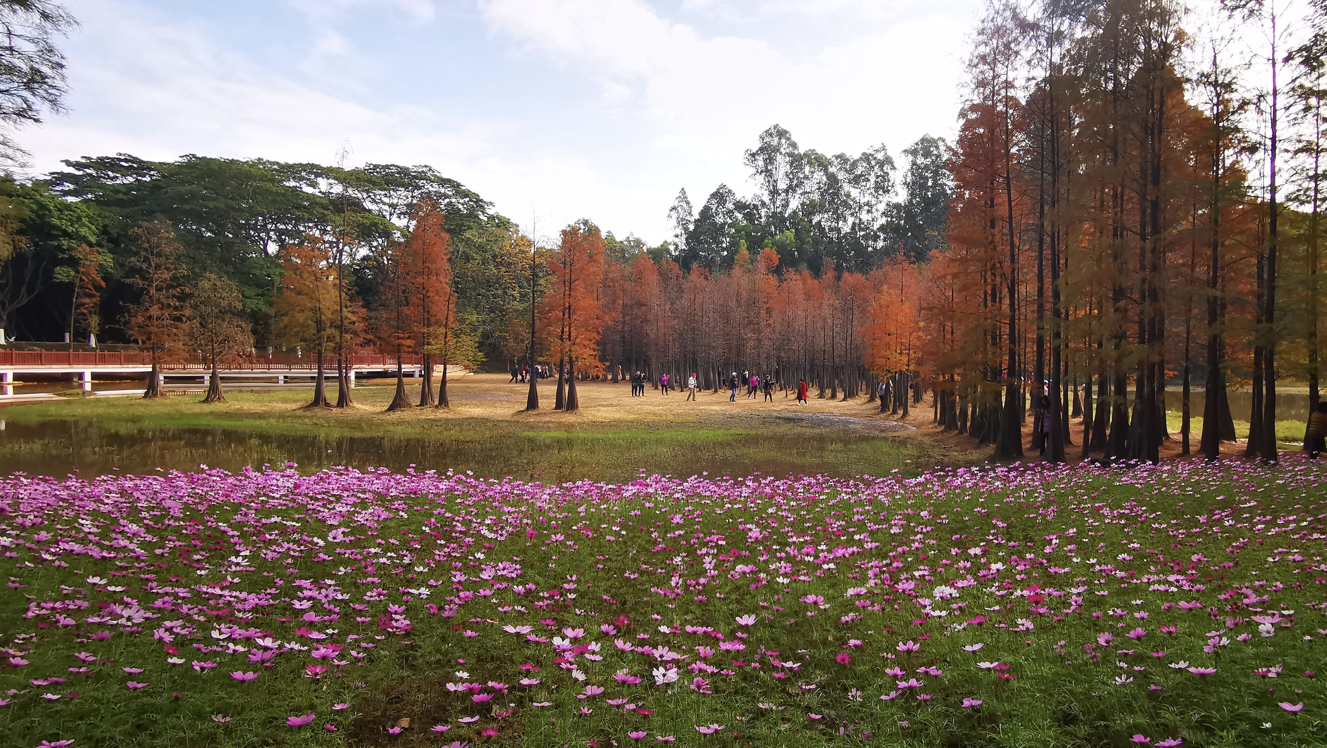 在公园北门的周地岗,落羽杉成片,染上了深红的色彩,水塘边的波斯菊也开了花。有的游客步行在栈道上观赏落羽杉景观,有的游客走进落羽杉林里拍照,有的游客在水塘边赏花。“大夫山森林公园共有7000株落羽杉,冬天由绿变红,非常壮观,吸引大量游客前来打卡,元旦来观赏也不算晚。”大夫山森林公园管理办公室有关工作人员表示。