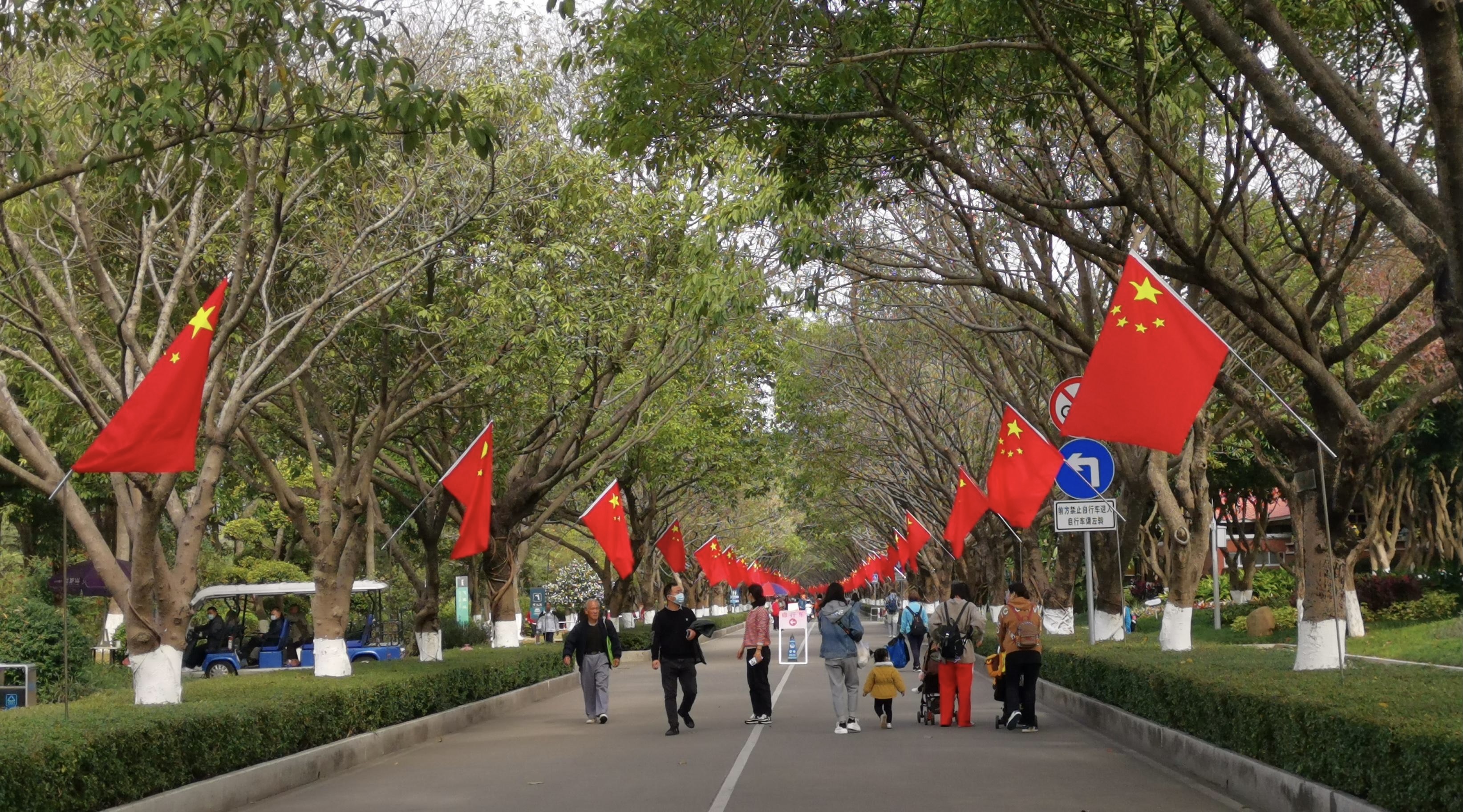 记者从大夫山森林公园南门进入,只见主干道两旁挂上了一面面鲜红的国旗;聚秀湖、红山湖、七盏灯水库,碧波荡漾,湖边的落羽杉染上了浅红的色彩,与碧水、蓝天相互辉映,三五成群的市民在步道上休闲散步,观赏风景。