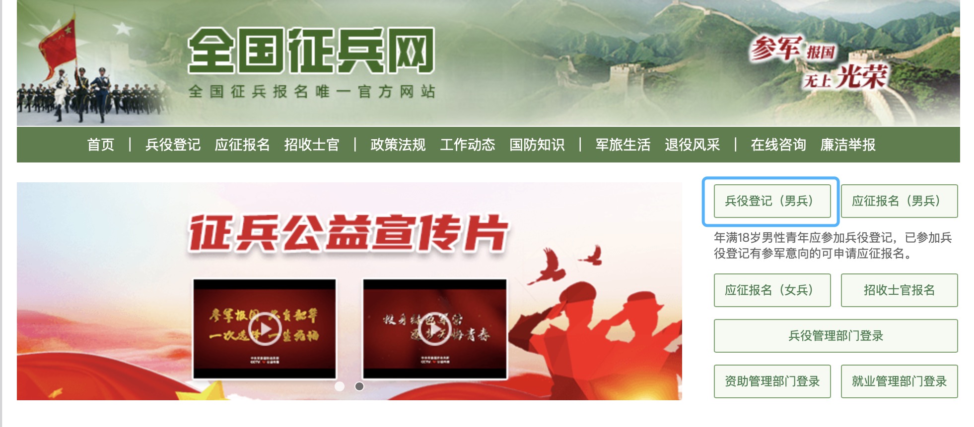 2022年6月30日前,男性适龄公民登录全国征兵网(http://www.gfbzb.gov.cn)进行网上登记,打印《男性公民兵役登记/应征报名表》,携带户口簿、居民身份证、学历证明、近期1寸免冠照片,到户口所在乡镇(街道)武装部进行现场确认,并领取《兵役登记证》。