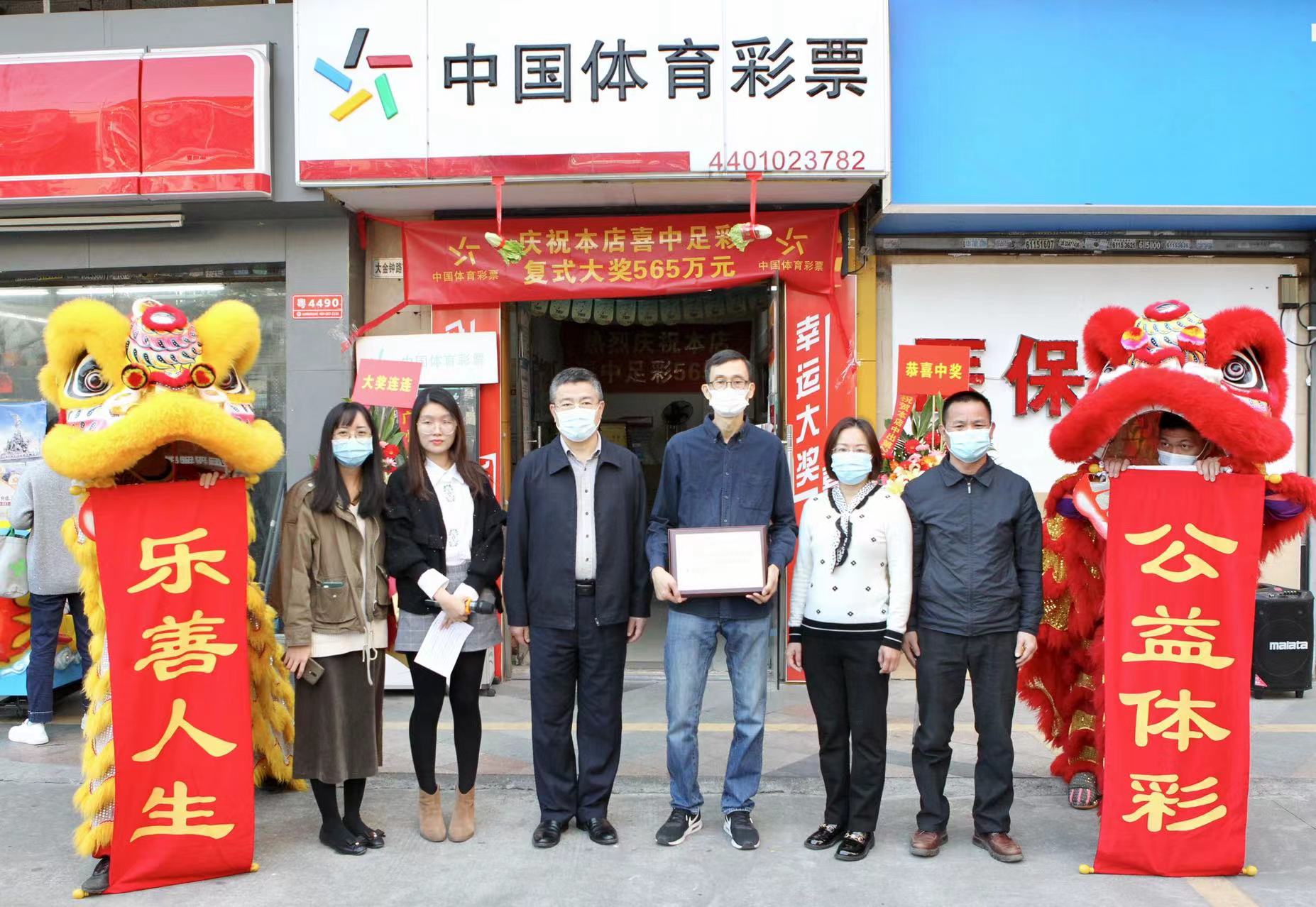 2022年1月6日上午,白云区体育彩票中心为中出大奖的实体店举行大奖庆祝活动,区文广旅体局领导向实体店业主颁发幸运销售牌匾。现场锣鼓喧天、醒狮助兴,吸引了不少附近的街坊围观,不少人还争相进店购买彩票想沾沾喜气,好不热闹。