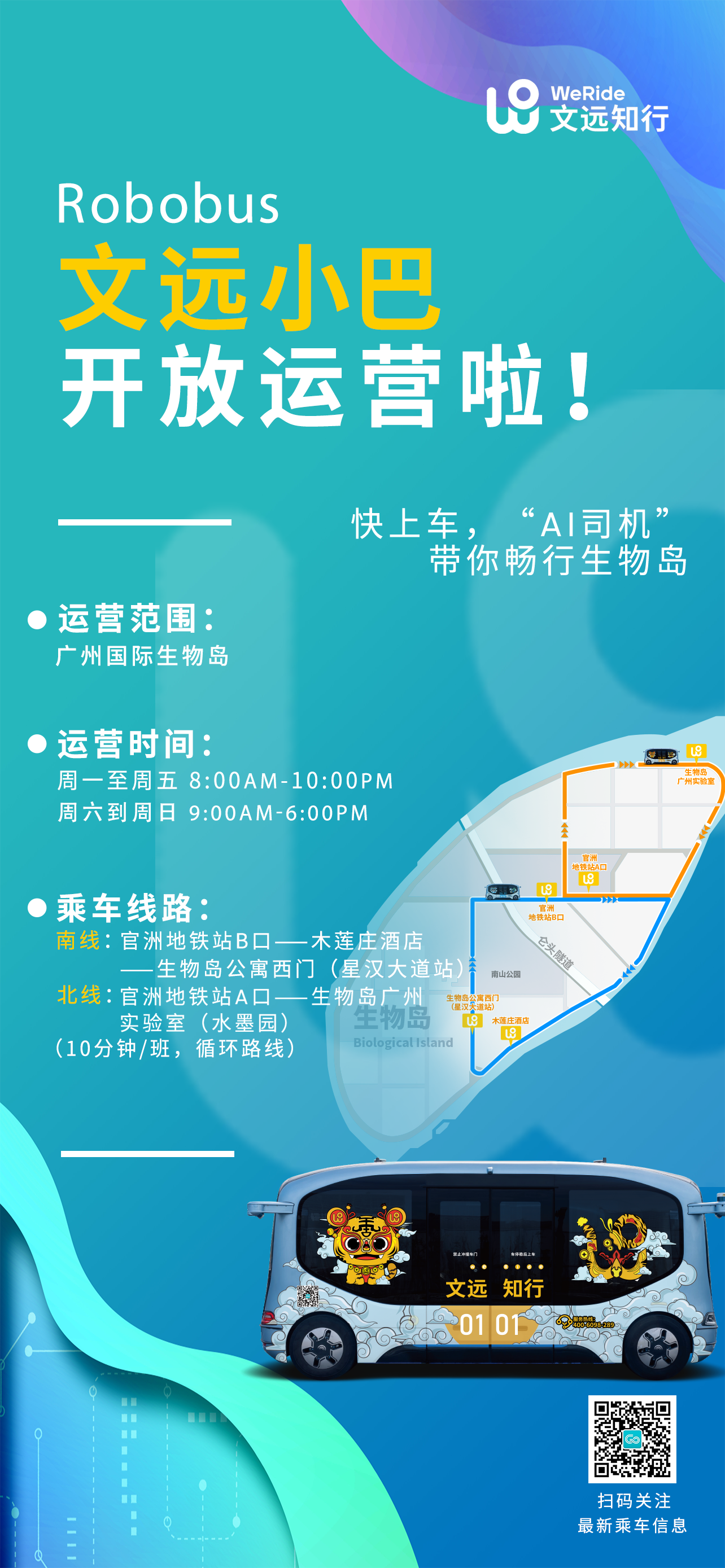 据悉,小巴每周运营7天无休,周一至周五早上8点到晚上10点,周六、周日早上9点到晚上6点,每隔十分钟循环发车运行。乘客可以通过文远知行自建的无人驾驶出行平台“WeRide Go”App查看车辆实时位置与运行状态,还可以通过关注“WeRide Go”微信公众号获取详细的乘车指南,了解最新运营信息。