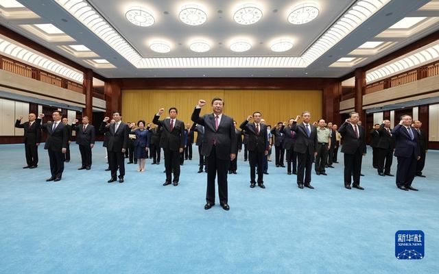 2021年6月18日,党和国家领导人习近平、李克强、栗战书、汪洋、王沪宁、赵乐际、韩正、王岐山等在中国共产党历史展览馆参观“‘不忘初心、牢记使命’中国共产党历史展览”。这是参观结束后,习近平带领党员领导同志一起重温入党誓词。