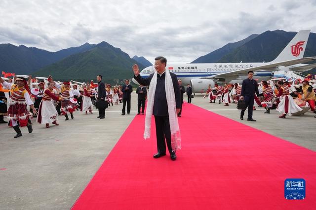 2021年7月21日至23日,中共中央总书记、国家主席、中央军委主席习近平来到西藏,祝贺西藏和平解放70周年,看望慰问西藏各族干部群众。这是21日上午,习近平乘坐飞机抵达林芝米林机场,西藏各族干部群众载歌载舞,热烈欢迎习近平总书记的到来。