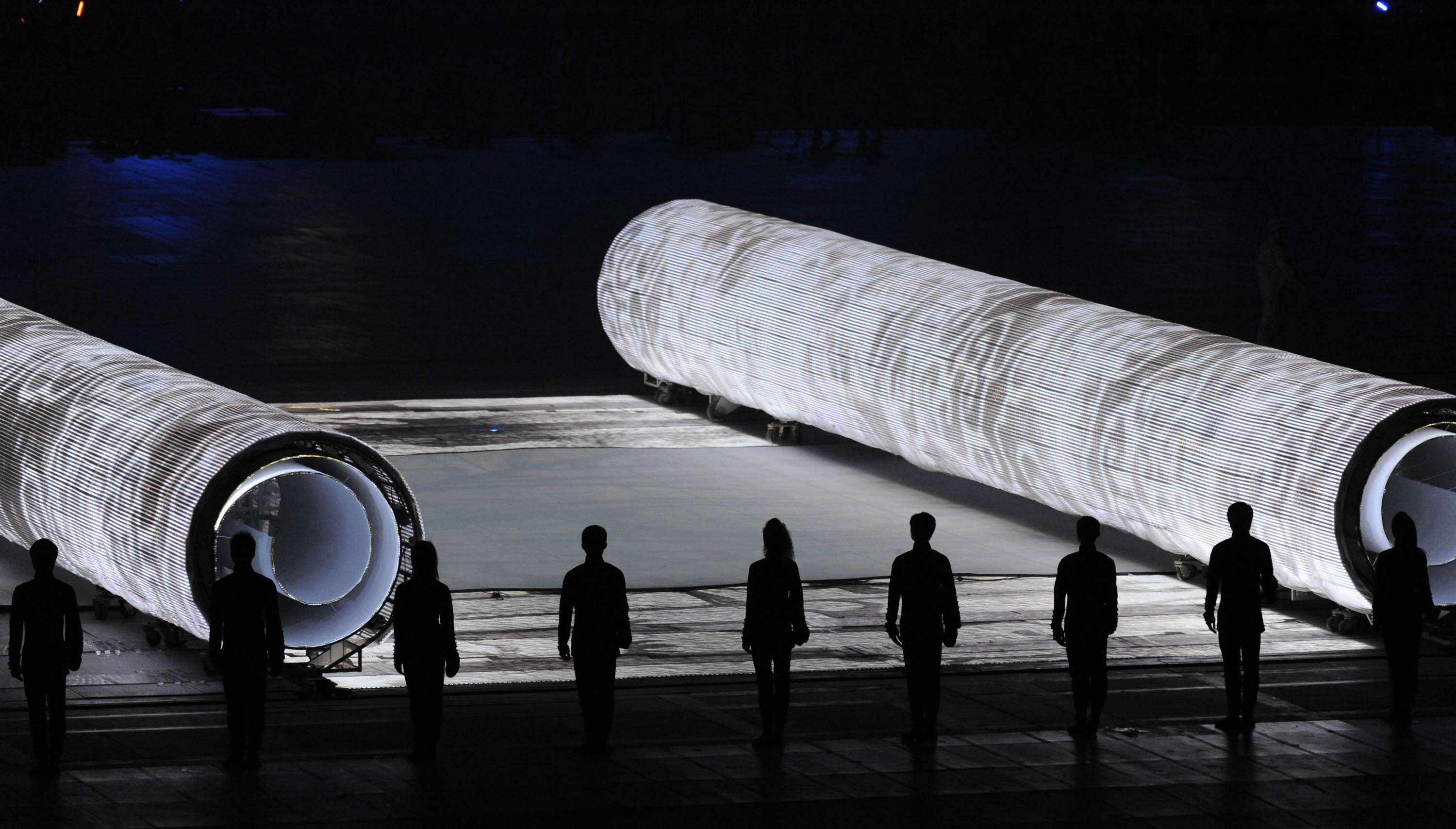 轮滑少年和机器人勾勒出冰雪运动的轻灵之美,立体演绎了冰球、冰壶等冬季体育项目;大飞机、空间站、高速铁路、现代化城市,“中国天眼”……现代中国的自信跃然纸上。