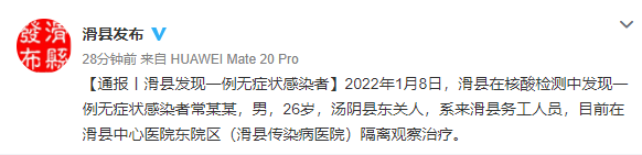据“滑县发布”消息,2022年1月8日,滑县在核酸检测中发现一例无症状感染者常某某,男,26岁,汤阴县东关人,系来滑县务工人员,目前在滑县中心医院东院区(滑县传染病医院)隔离观察治疗。
