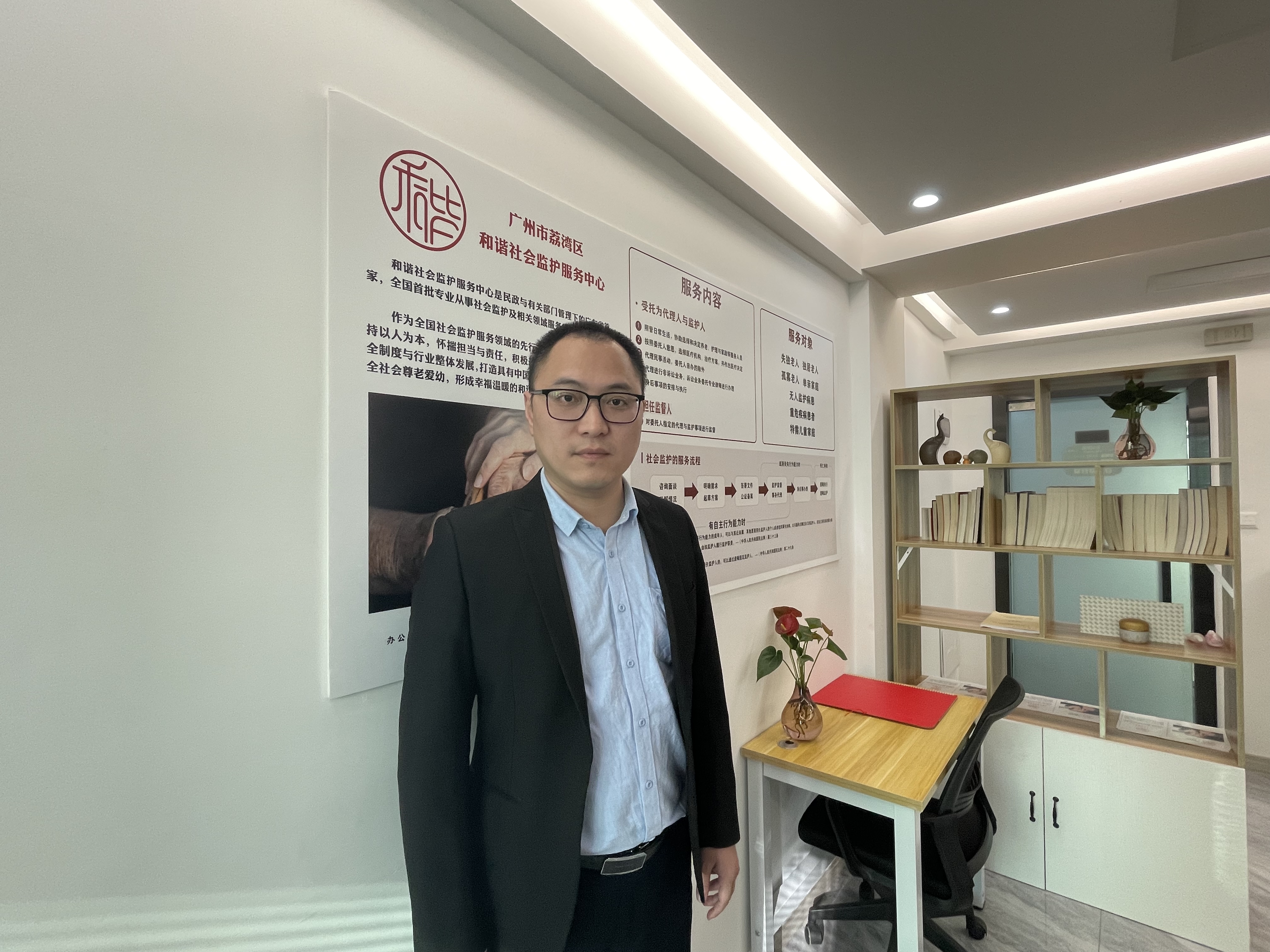 在中山八路附近的荔河商贸中心6楼一间不大的写字楼里,记者见到了和谐社会监护服务中心的理事长蔡盛,他办公桌后的书架上摆着一排《民法典》,墙壁上还张贴着大幅宣传海报。海报介绍中心的主要服务对象——失独老人、独居老人、孤寡老人、单亲家庭、无人监护病患、重危疾病患者、特需儿童家庭。