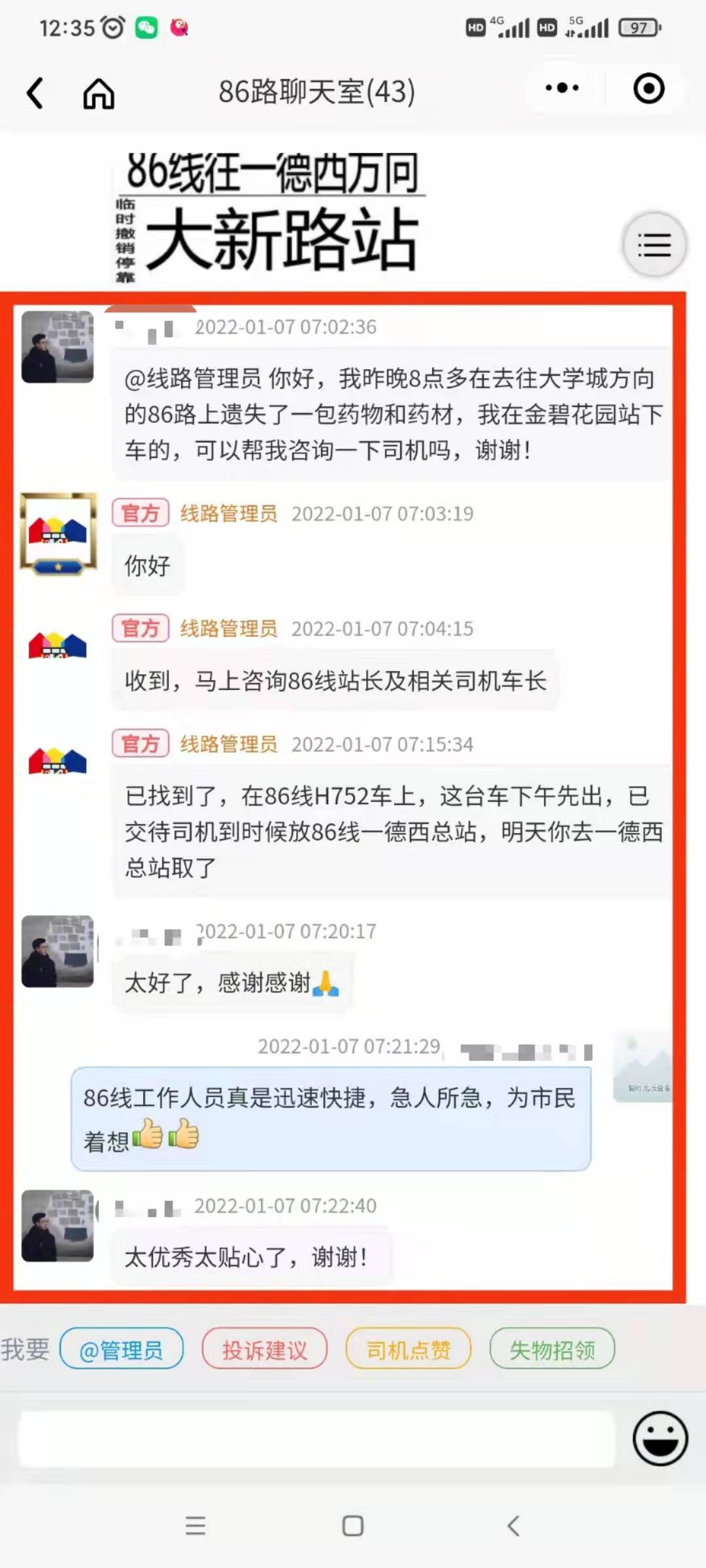 这时,陶女士忽然想起,她平时使用“广州公交社区”小程序时,曾看见过有“失物招领”这一功能,于是1月7日早上,抱着碰运气的心态,陶女士在“广州公交社区”小程序86线“线路聊天室”里,讲述了自己的情况,请求线路管理员协助。