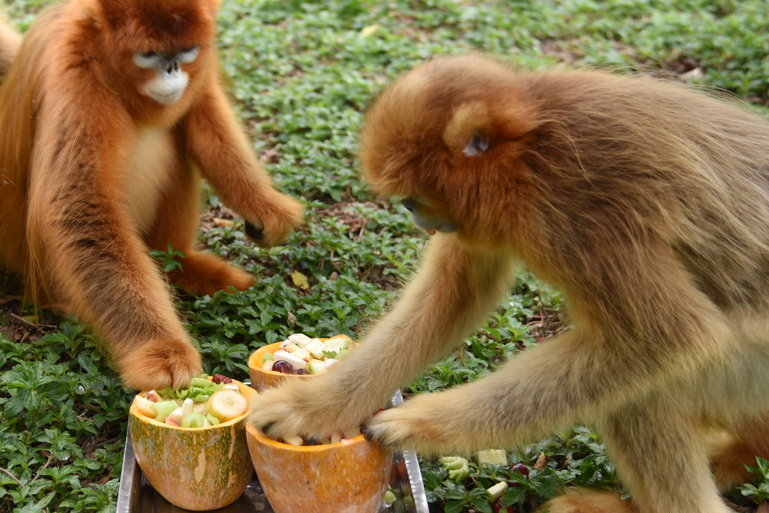 金丝猴享用的“腊八粥”是采用苹果、香蕉、哈密瓜、红枣、提子、花生等十多种食物制作而成,用南瓜做成的“器皿”。不仅色彩鲜艳且营养丰富,金丝猴尽情享用食物。