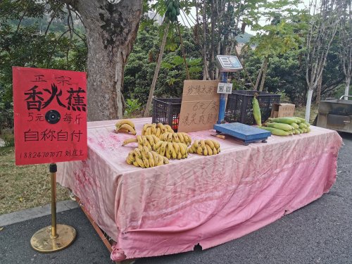 在增城区荔枝文化公园内,记者看到一个“香火蕉”自助售卖摊位,摊位上摆放有本地香蕉和水果玉米,同时有称重秤和收款的微信二维码。该摊位无人值守,全凭游客自称自付,记者在现场看到,不时有游客驻足细看,也有人自行称重付款。摊位旁告示自称所售卖香蕉为正宗“香火蕉”,何谓“香火蕉”?农庄主人刘先生告诉记者,农庄采用传统的香薰法催熟香蕉已十余年,虽制作方法较繁琐且费时较长,但香薰法环保,且由此催熟的香蕉口味甘甜,长久以来吸引了不少回头客。