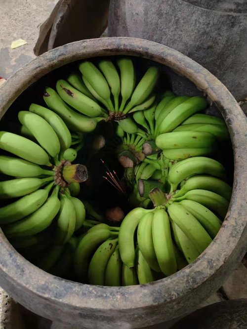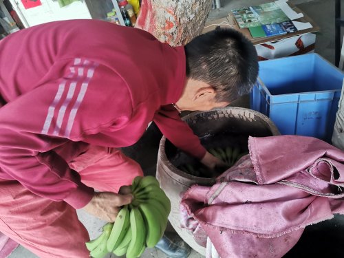 记者了解到,刘庄主的“香火蕉”制作过程极为朴素有趣。香蕉采摘回来后,先将成捆的香蕉放置农庄室内风干吹晾十余天,然后将香蕉一扎一扎切割好分层放入密闭的陶制缸内,取五只左右的细香点燃插入缸内,然后将陶瓷缸封闭三天左右。封闭的过程中,香蕉在缸内凭借细香释放的烟火余温完成淀粉与糖分的转换,三天后打开密封盖任其后熟。