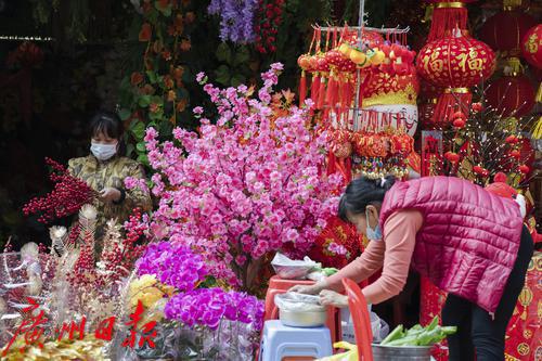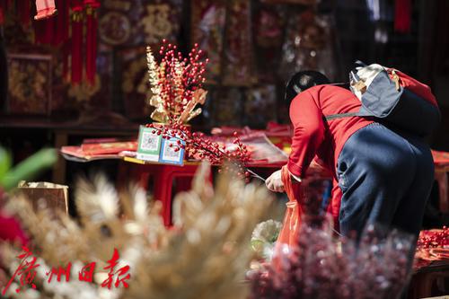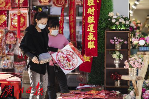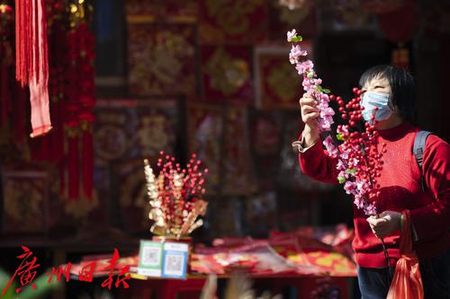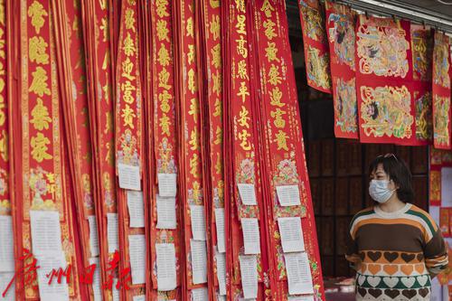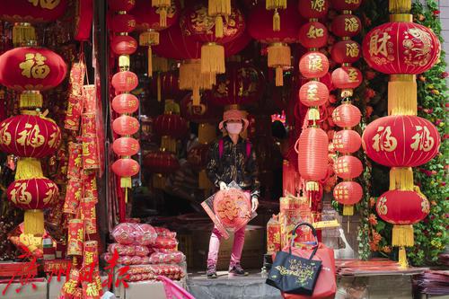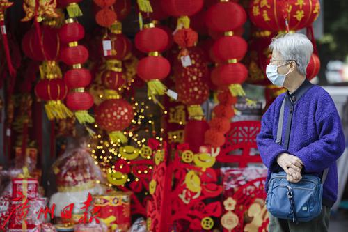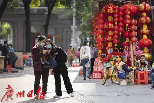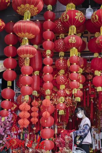 过年的脚步将近,广州市一德路,红彤彤的灯笼、年画、对联、年花等喜庆用品又成为街头一到明艳的风景线,不少市民提前来此采购年货。图片摄于2022年1月7日。图/广州日报·新花城记者:陈忧子
