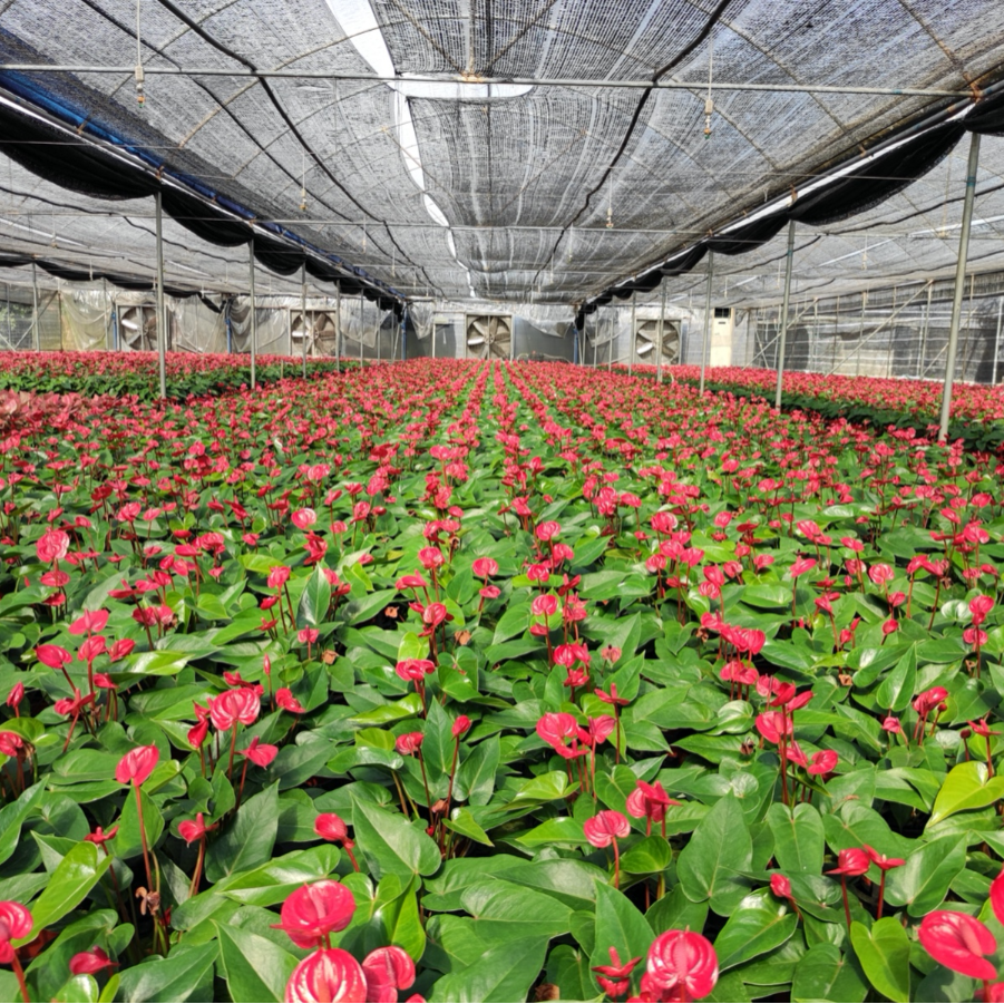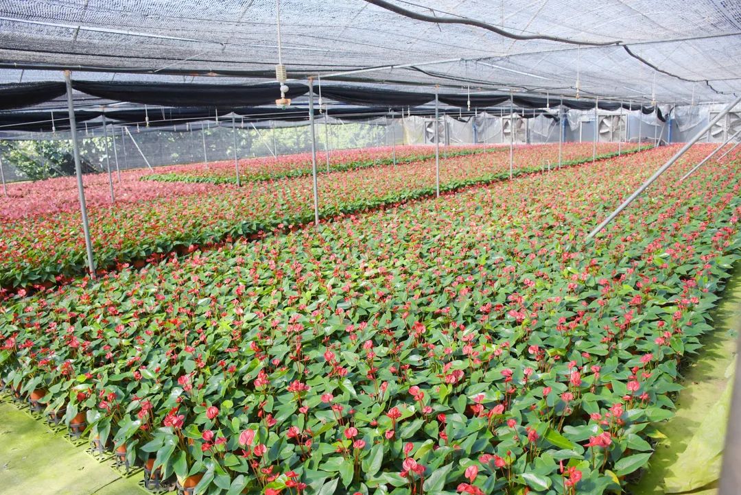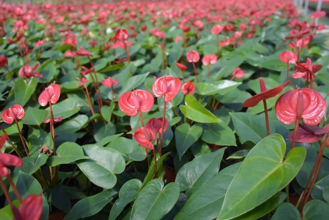 相比白掌,由于红掌的投入更多,价格大概是白掌的2倍,种植红掌的花农相对更少一点,而在屈金华的花场里,红掌正开得红彤彤,十分艳丽。