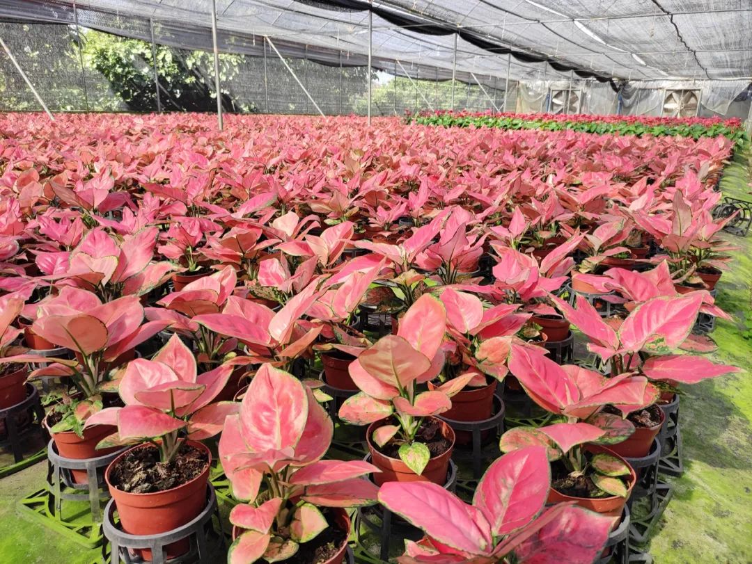 其实一开始入行,屈金华也是主打传统泥土种植的大盆栽,但从2013年开始,他根据市场的变化,开始尝试种植小盆栽,如今主打的品种有红掌、白掌、如意。