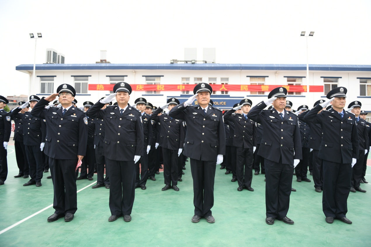 上午11时许,参加仪式的100余名民警警容严整,整齐列队, 3名护旗手迈着整齐、矫健的步伐护卫警旗走到升旗台。敬礼!由红蓝两色组成、彰显人民警察队伍绝对忠诚、代表人民警察护卫平安的警旗冉冉升起,在场民警庄严向警旗敬礼致敬。