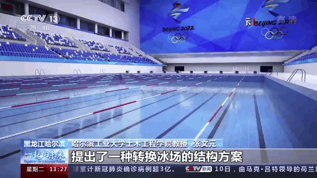 哈尔滨工业大学土木工程学院教授 张文元:我想我们最重要的一个工作,就是从无到有,从0到1的过程,提出了一种转换冰场的结构方案。最大的亮点就是可以快速实现泳池到冰场的功能转换,所有钢结构、混凝土面板都是组装的,可以随时进行安装,10天到20天时间就可以完成。效率很高,经济性也好,而且可以重复使用。