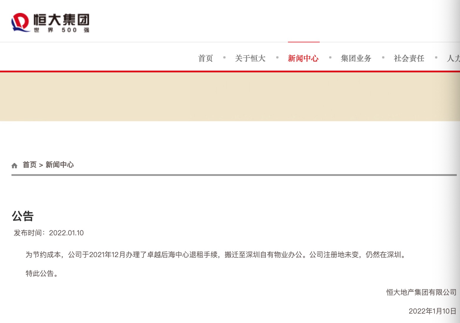 1月10日,恒大集团官网发布公告称,为节约成本,公司于2021年12月办理了卓越后海中心退租手续,搬迁至深圳自有物业办公。公司注册地未变,仍然在深圳。