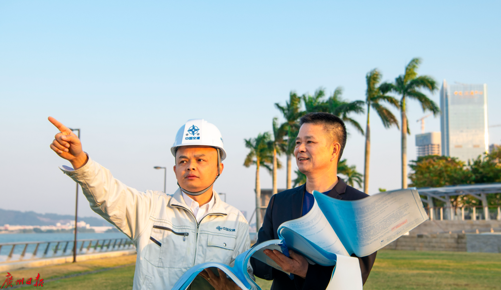 中交南沙新区明珠湾区工程总承包项目经理部的总工程师何锦明(左),与同事讨论施工细节
