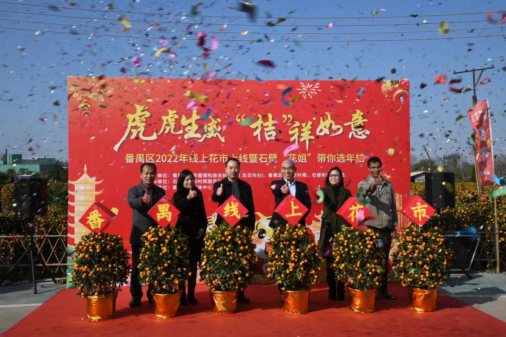 1月11日,“虎虎生威 ‘桔’祥如意——番禺区2022年线上花市上线暨石壁‘花姐’带你选年桔”在石壁街都那村(年桔文化之乡)举行,正式开启2022年“番禺线上花市”。