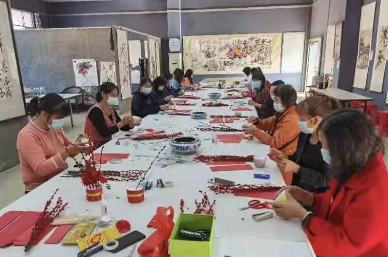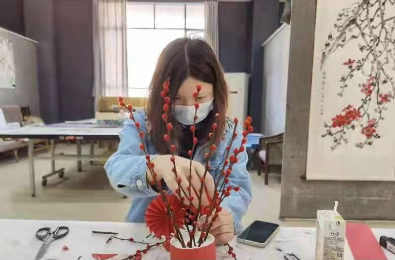 在老师的指导下,学员们各自发挥想象力,完成了一盆盆精致漂亮的银柳福盘,现场一片欢声笑语。