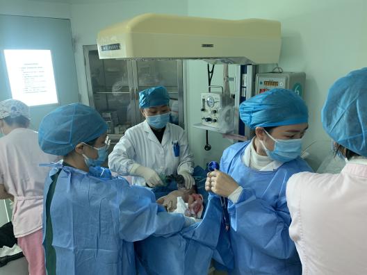 然而医护人员并没有因此松了一口气。通常情况下,新生儿出生时全身红润,哭声洪亮,然而这个宝宝却肤白如雪,心跳微弱。大家瞬间明白了胎儿窘迫的原因——胎母输血综合征。新生儿科副主任经郭艳辉带领肖小芳医生投入“战斗”,对“雪宝宝”立即给予气管插管复苏囊正压通气给氧,保暖下转送新生儿科继续抢救治疗。