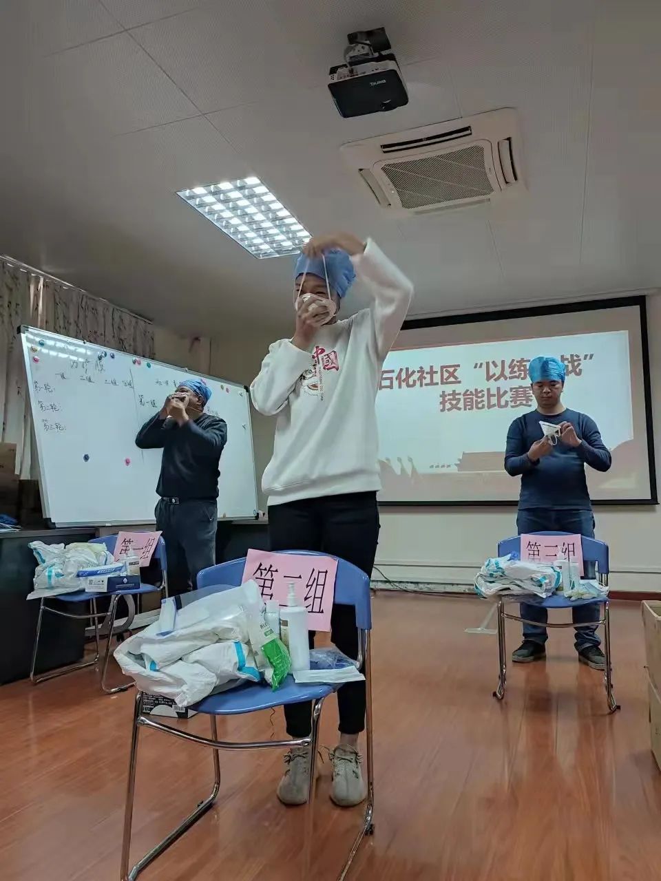当天,石化社区党委特邀来自黄埔区中医医院的专业医护团队,为参训人员现场开展穿脱防护服的示范讲座,详细讲解穿脱防护服的用物准备、穿脱步骤、注意事项、防护及消毒处理等具体细节。