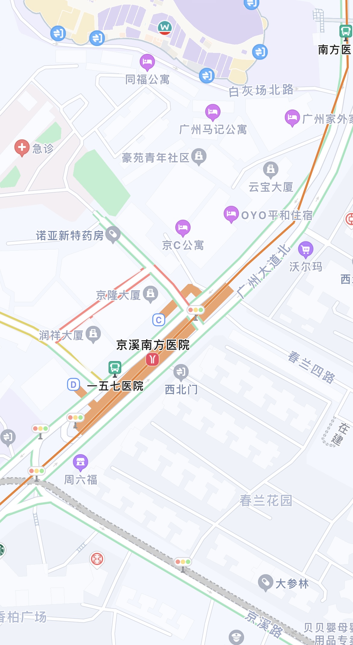 (京溪南方医院站往来南方医院,需等红绿灯横过广州大道北)