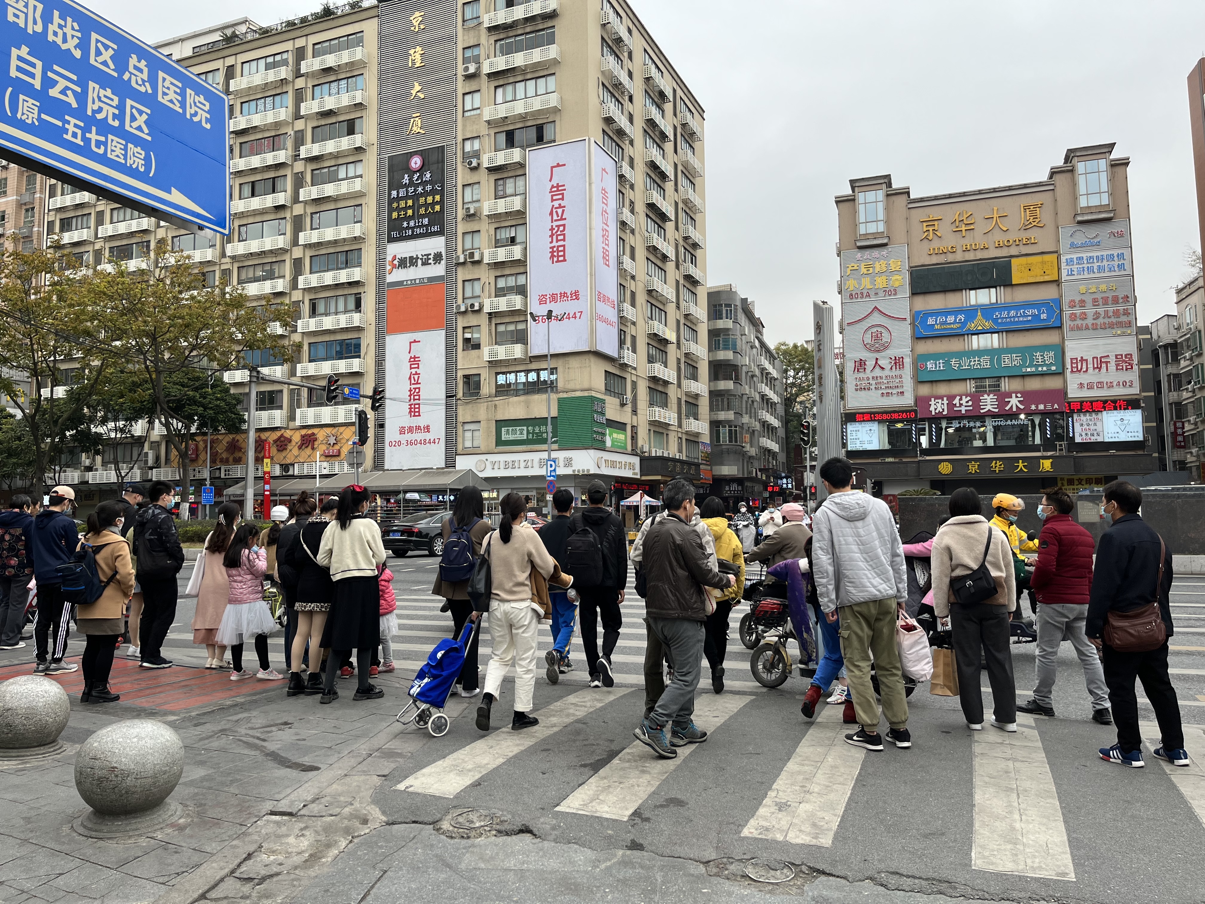 (京溪南方医院站C口旁边的斑马线,下午3时非繁忙时间,每次依然有超60人在现场等灯过马路)