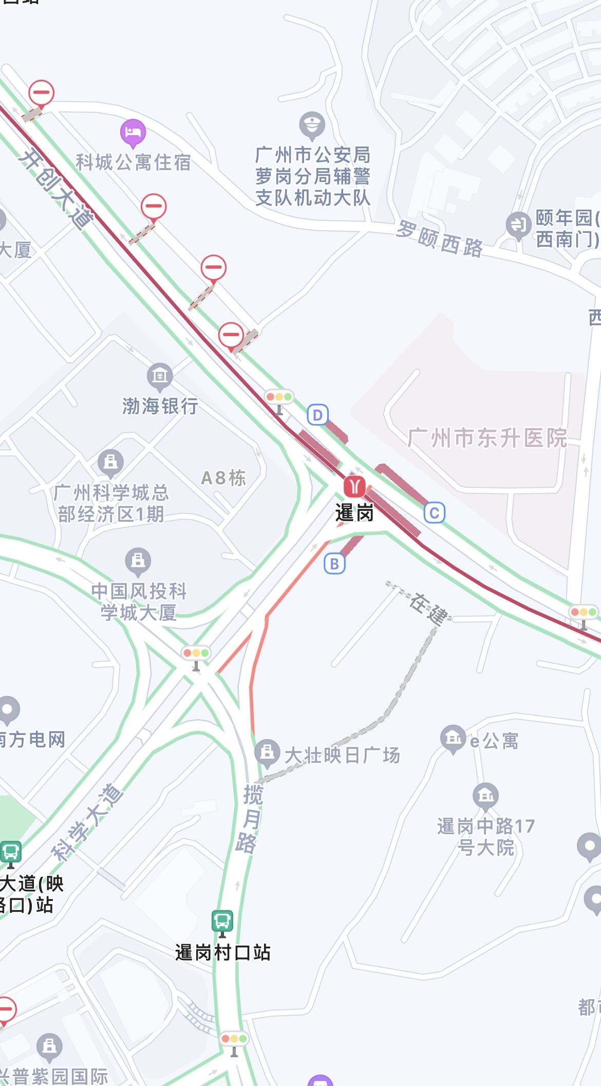 如果觉得上面这些出入口距离开通还有点远,那么,6号线暹岗站的A口有可能是最快能够和街坊见面的出入口。暹岗站位于开创大道和科学大道交界的丁字路口,已开通三个出入口,唯独缺了科学大道西北侧,该侧地块为广州科学城总部经济区,多家企业总部落户于此,上下班通勤需求旺盛。