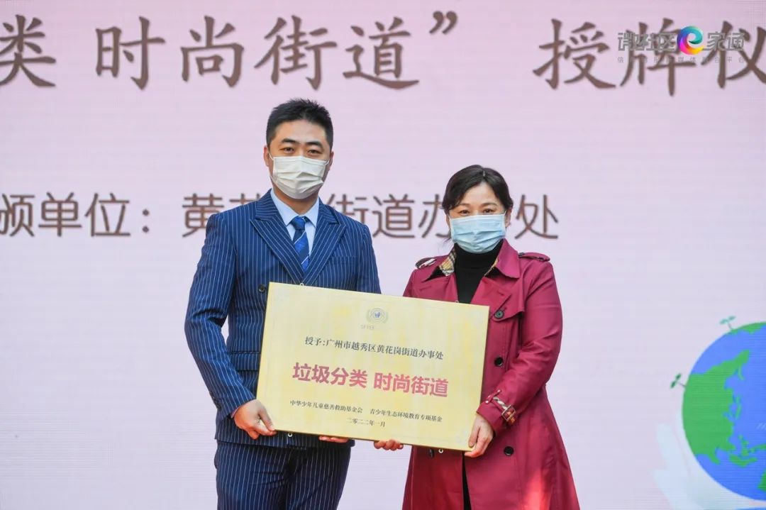 中华少年儿童慈善救助基金会青少年生态环境教育专项基金授予黄花岗街“垃圾分类时尚街道”荣誉牌匾。