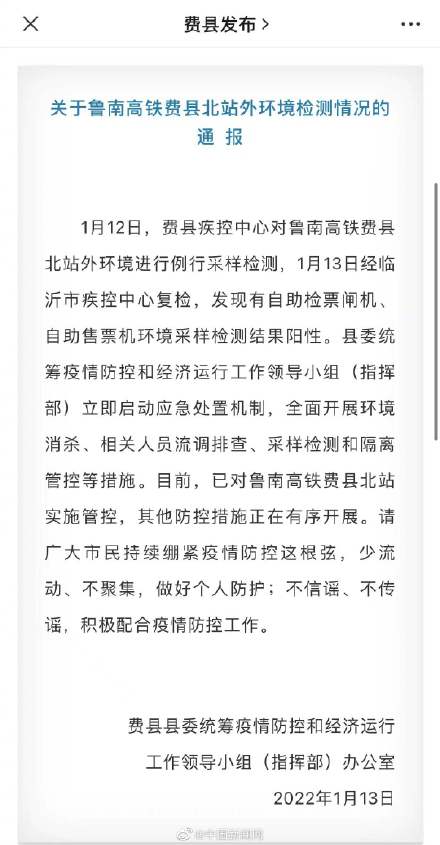 据微信公众号“费县发布”消息,1月12日山东费县疾控中心对鲁南高铁费县北站外环境进行例行采样检测,发现有自助检票闸机、自助售票机环境采样检测结果阳性。目前,已对鲁南高铁费县北站实施管控。