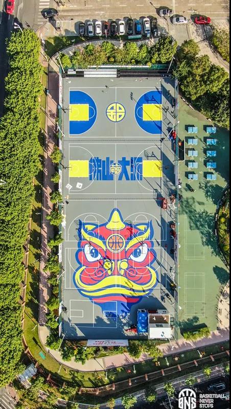 从高空俯瞰,体育公园中央一个面积约2700㎡的“醒狮”涂鸦形象格外显眼,成为独特的网红地标。“涂鸦运用全人工手绘工艺,把篮球运动与佛山传统文化相结合,更好地传递体育与传统文化。”负责人表示。